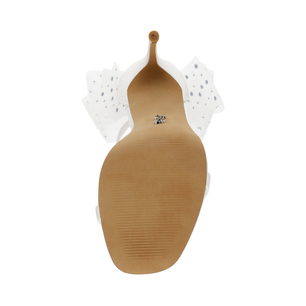The NIKOLE sandal features a stiletto heel and a round toe, giving the design sleek lines that contrast with the voluminous bow at the back of the ankle.